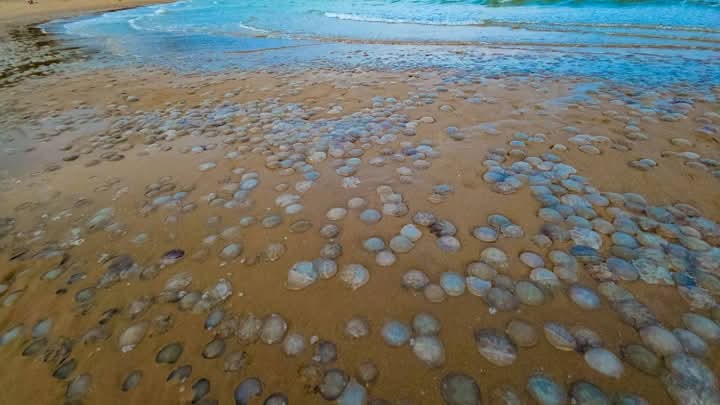 ภาพที่เห็นตรงหน้าไม่ใช่ภาพจากสารคดีธรรมชาติ แต่เป็นเรื่องจริง แมงกะพรุนจำนวนมหาศาลถูกพัดขึ้นมาบนชายหาด มีทั้งขนาดเล็ก กลาง และใหญ่ รวมตัวกันอย่างหนาแน่นในบริเวณเนินทรายสูง กระจายเป็นวงกว้างประมาณ 30 เมตร บางตัวยังมีชีวิต บางตัวเริ่มแห้งตายไปกับแสงแดด สร้างทั้งความตื่นตาตื่นใจ และความกังวลใจไปพร้อมกัน