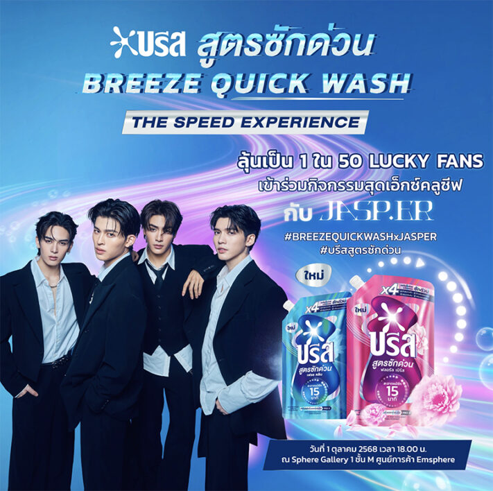 ห้ามพลาด! งาน “BREEZE QUICK WASH : THE SPEED EXPERIENCE” จะจัดขึ้นใน วันพุธที่ 1 ตุลาคม 2568 เวลา 18.00 – 19.40 น. ณ Sphere Gallery 1 ชั้น M ศูนย์การค้าเอ็มสเฟียร์ ผู้ที่สนใจเข้าร่วมกิจกรรมและติดตามรายละเอียดเพิ่มเติม สามารถดูได้ที่ Facebook: Breeze Thailand (บรีส ประเทศไทย).