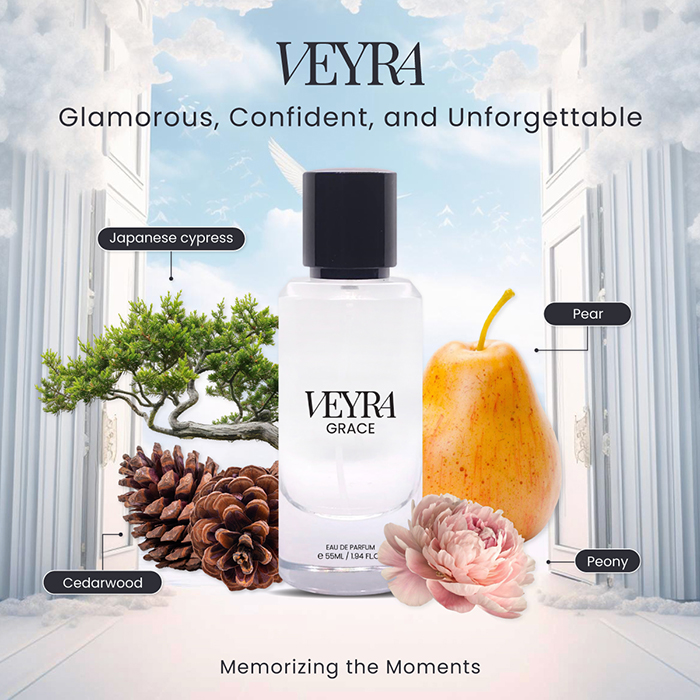 - กลิ่น : VEYRA GRACEเวฬาแห่งความสง่างาม (เสน่ห์เจิดจรัส) โทนกลิ่นหลัก : แพร์อองซู, พีโอนี, ขี้ผึ้ง, ไซเปรสญี่ปุ่น