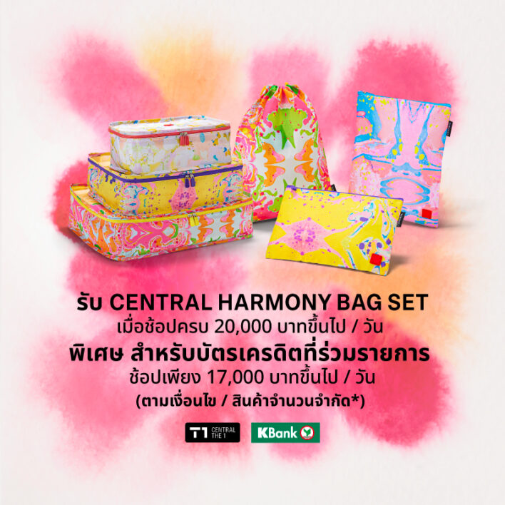 - แลกรับของสมนาคุณสุดพิเศษ: เพียงช้อปครบ 20,000 บาทขึ้นไป/วัน รับฟรี! เซ็ตกระเป๋า Central Harmony Bag set (ยอดช้อปพิเศษ 17,000 บาทสำหรับผู้ถือบัตรเครดิตเซ็นทรัล เดอะวัน และบัตรเครดิตกสิกรไทย)
