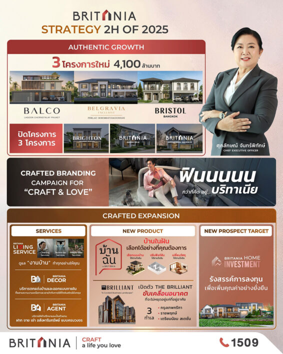 กรุงเทพฯ – บริษัท บริทาเนีย จำกัด (มหาชน) หรือ BRI ตอกย้ำความเป็นผู้นำด้านโครงการที่อยู่อาศัยแนวราบ ด้วยการเปิดเผยกลยุทธ์สำคัญสำหรับช่วงครึ่งปีหลัง เพื่อรักษาการเติบโตอย่างยั่งยืน โดยมุ่งเน้นการตอบโจทย์ลูกค้าอย่างเฉพาะกลุ่มผ่าน 3 แกนหลักสำคัญ ได้แก่ AUTHENTIC GROWTH STRATEGY, CRAFTED BRANDING CAMPAIGN FOR “CRAFT&LOVE” และ CRAFTED EXPANSION ซึ่งสะท้อนถึงความมุ่งมั่นในการสร้างโอกาสใหม่ทางธุรกิจและการขยายฐานลูกค้า