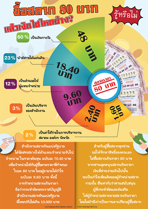ตามโครงสร้างการจัดสรรรายได้ของกองสลาก (อ้างอิงจากพระราชบัญญัติสำนักงานสลากกินแบ่งรัฐบาล และระเบียบที่เกี่ยวข้อง) รายได้จากการจำหน่ายสลากจะถูกแบ่งออกเป็น 3 ส่วนหลัก: