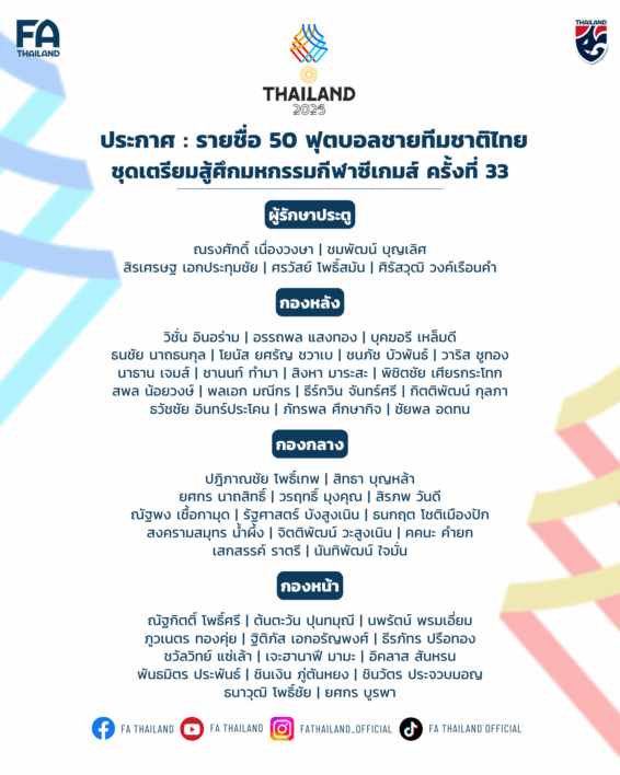 สมาคมกีฬาฟุตบอลแห่งประเทศไทย ในพระบรมราชูปถัมภ์ ได้ประกาศรายชื่อนักกีฬาฟุตบอลชายทีมชาติไทย ชุดแรกจำนวน 50 คน ที่อยู่ในข่ายการพิจารณา เพื่อเตรียมลงแข่งขันในมหกรรมซีเกมส์ ครั้งที่ 33 ซึ่งประเทศไทยรับหน้าที่เป็นเจ้าภาพ ระหว่างวันที่ 3-20 ธันวาคม 2568